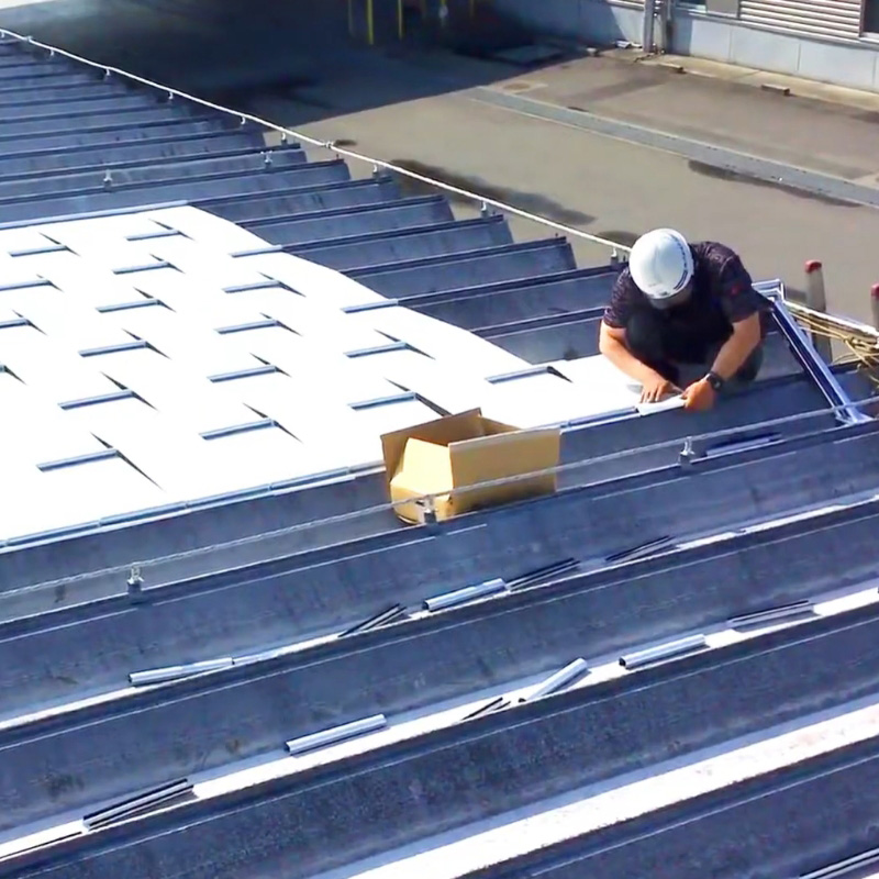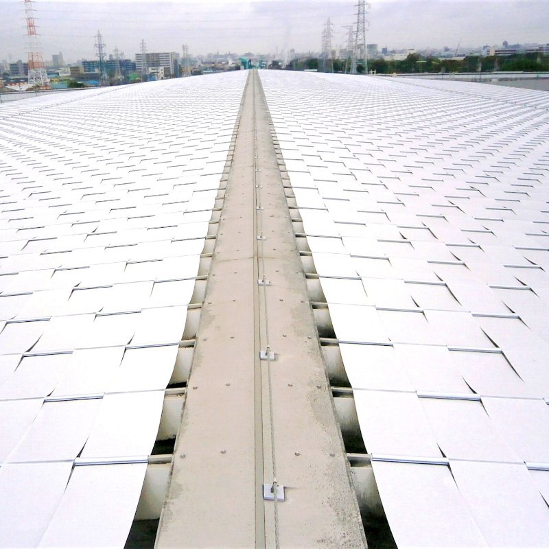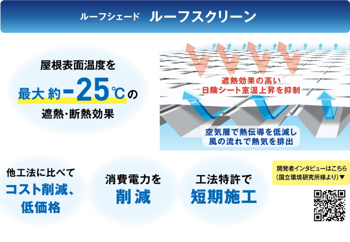 金属製折板屋根の上面を、非常に高い遮熱効果を持つ日陰シートで覆うことにより、屋根の表面温度を大幅に低減する事が出来ます。更に、他工法と比べ、 ”低価格・短期施工・優れた耐久性” を実現しました。